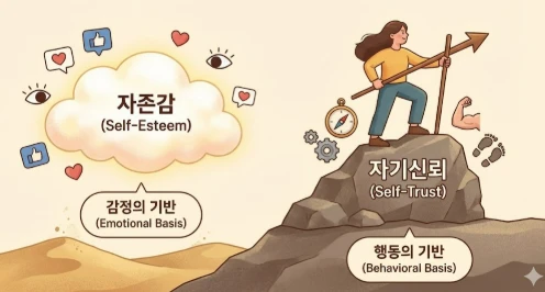 우선 두 개념의 차이를 명확히 짚고 넘어가야 합니다. '자존감'은 말 그대로 나에 대한 감정적인 평가입니다. 나 자신을 소중히 여기고 사랑할 수 있는 능력이며, 내가 가치 있는 존재임을 인정하는 마음이죠. 반면 '자기신뢰'는 내가 어떤 상황에서도 나를 믿고, 내가 내린 판단을 따를 수 있는 믿음을 뜻합니다.
